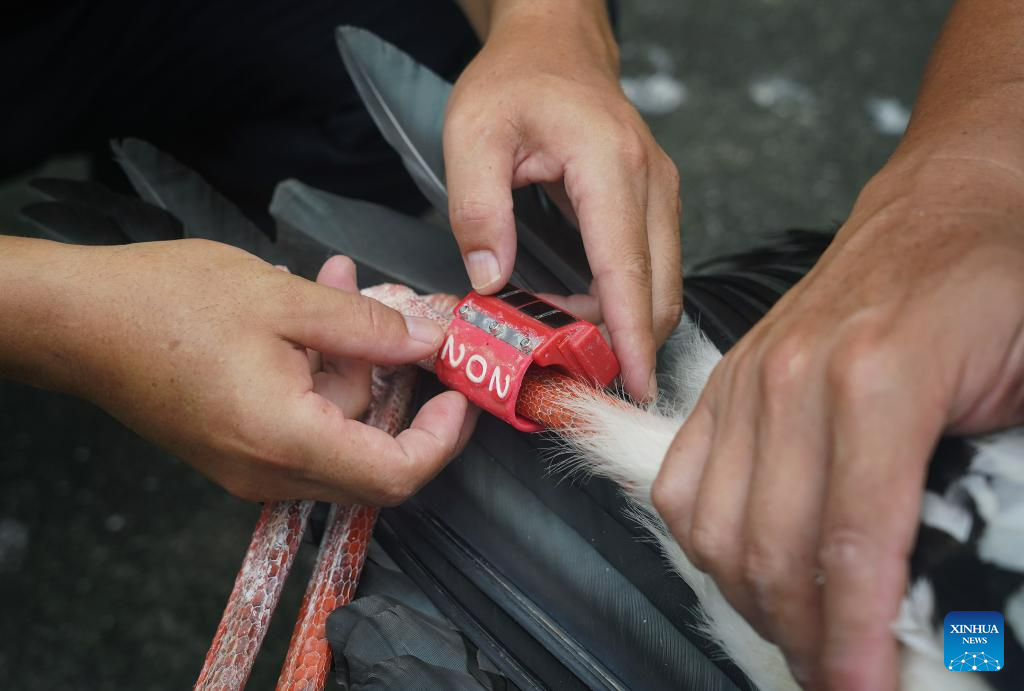 Staff members put a GPS tracker on an oriental white stork that was about to be released in the Wildlife Rescue and Breeding Center of Jiangxi Province in Nanchang, east China's Jiangxi Province, July 20, 2023. Staff members composed of rescuers, doctors, patrolmen and police officers in the protection station of Poyang Lake National Nature Reserve and the Wildlife Rescue and Breeding Center of Jiangxi Province rescue injured migratory birds and help them return to the wild. (Xinhua/Wan Xiang)