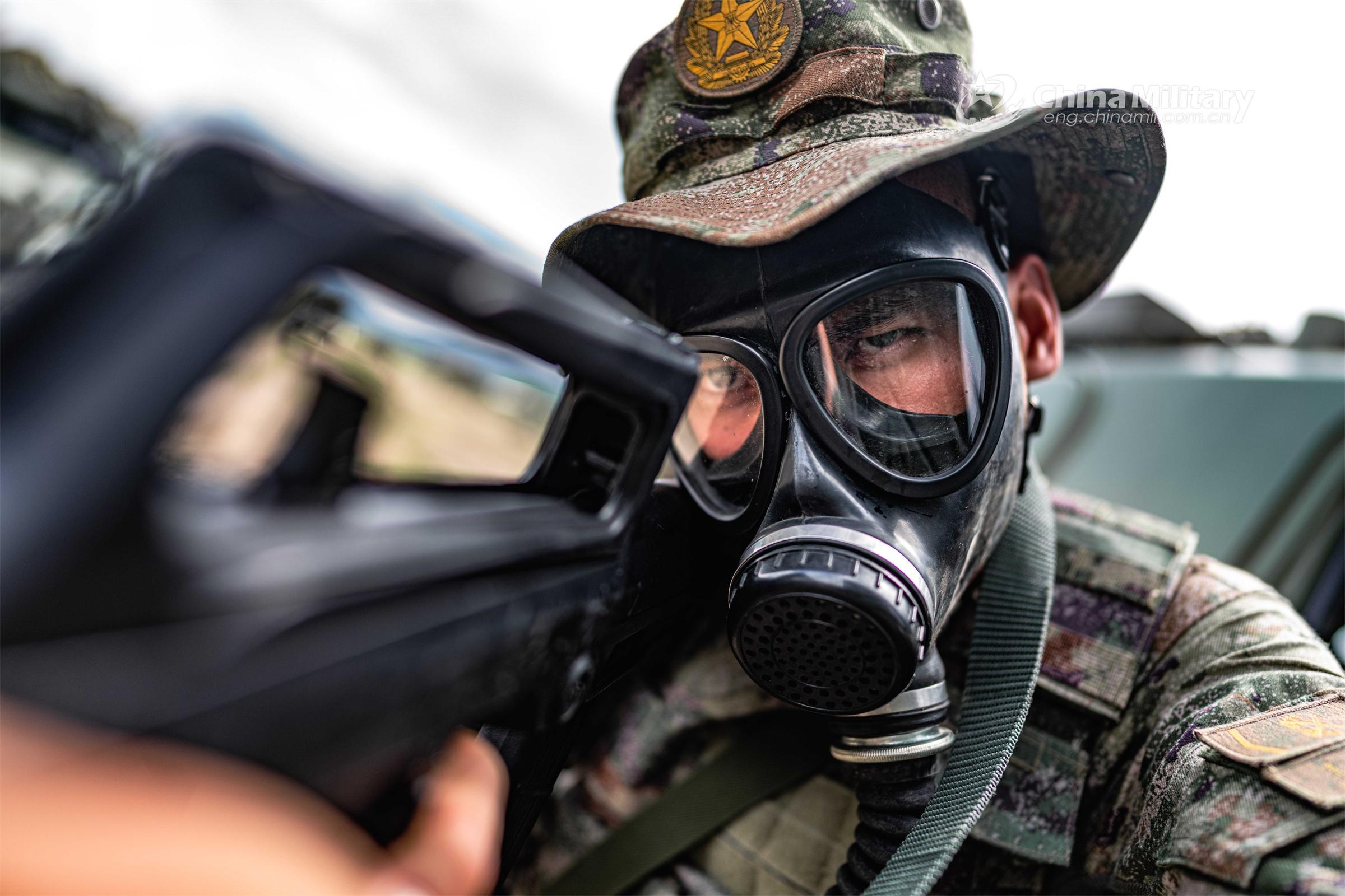 A soldier assigned to a chemical defense element of a brigade under the PLA 75th Group Army provides cover for his fellows during a comprehensive chemical training exercise on July 12, 2023. (eng.chinamil.com.cn/Photo by Teng Zhaoseng)