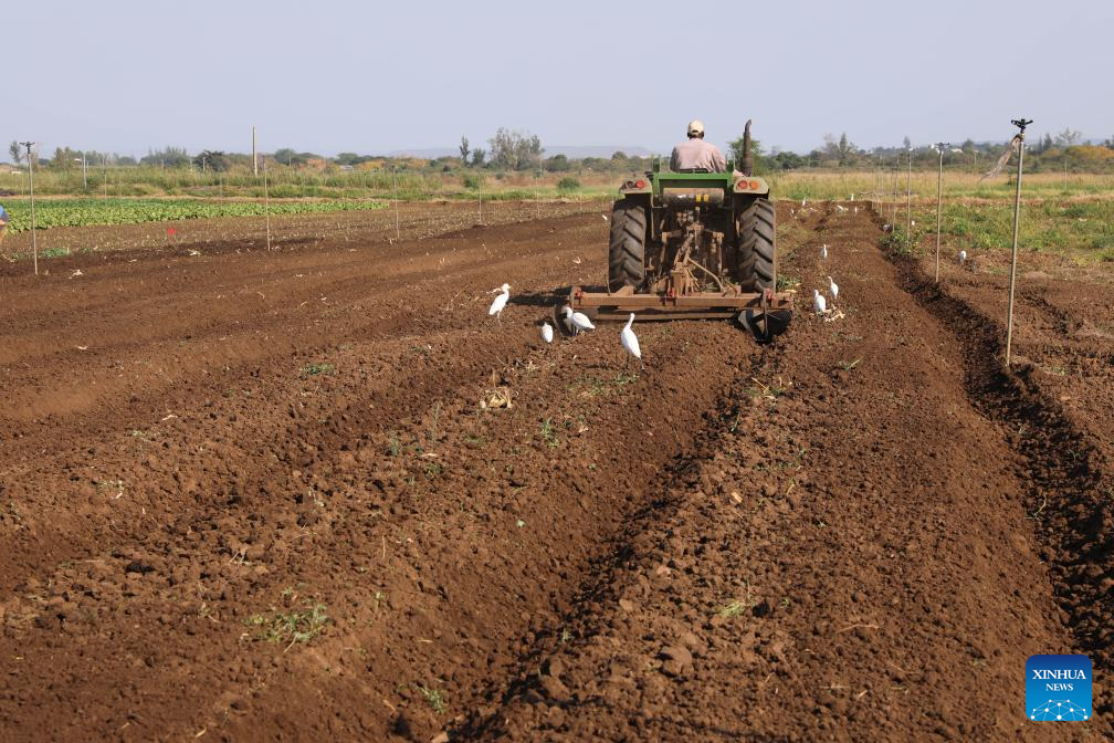 A worker plows the field at the China-Mozambique Agricultural Technology Demonstration Center in Boane district of Maputo Province, Mozambique, July 28, 2023. Built in 2010, the demonstration center is an important cooperation project between the Chinese and Mozambican governments. Apart from doing agricultural experiments, the center is also involved in the training of local farmers. (Xinhua/Dong Jianghui)