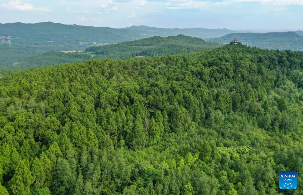 This photo taken on July 24, 2023 shows ancient cypress trees in the Cuiyunlang section of an ancient road system known as "Shudao" in Jiange County of Guangyuan City, southwest China's Sichuan Province. (Xinhua/Wang Xi)