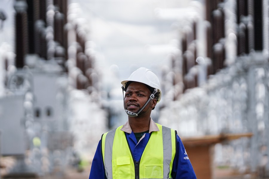 David Maina Kamore checks the operating status of devices at the construction site of Konza transformer substation in Machakos County, Kenya, May 5, 2023. (Xinhua/Han Xu)