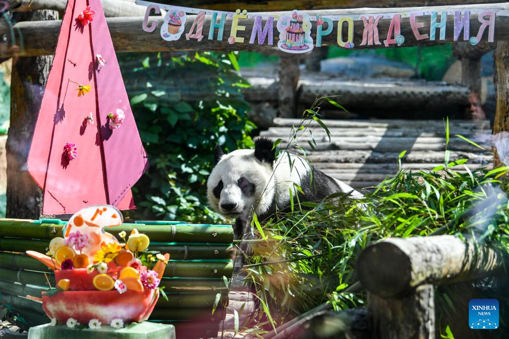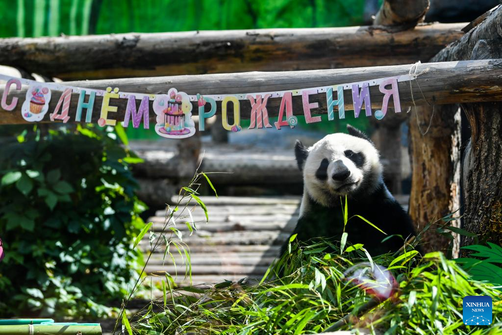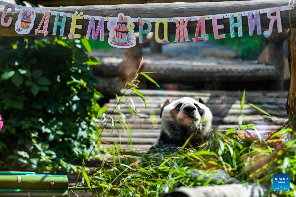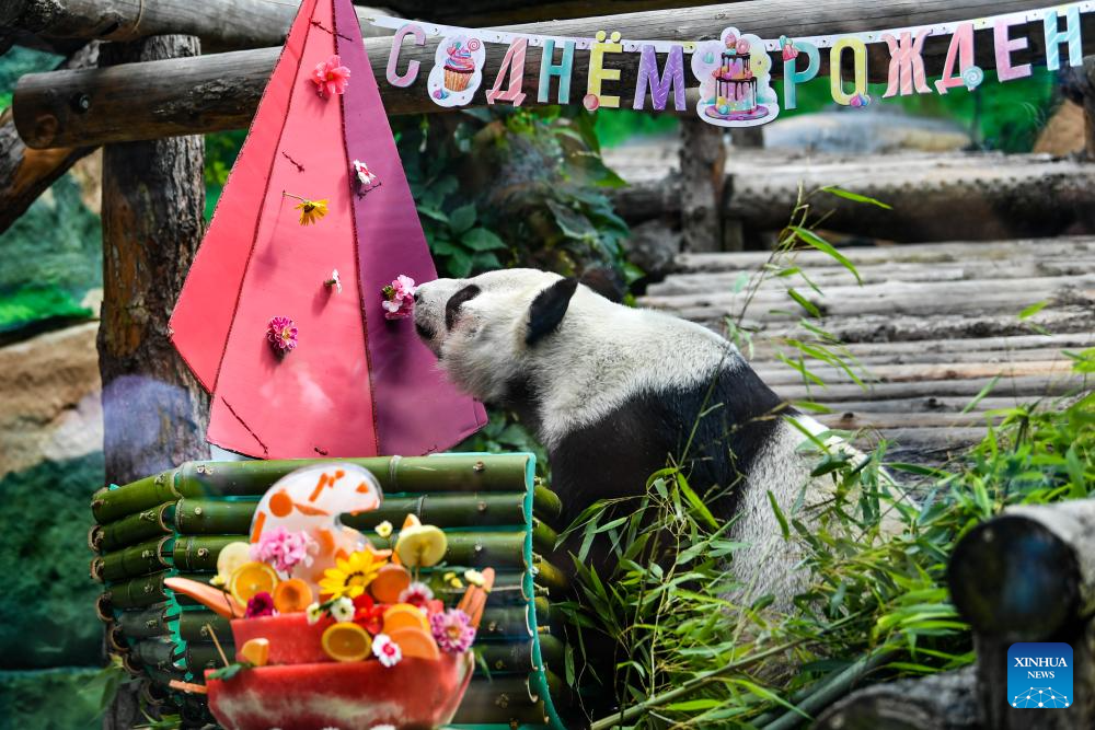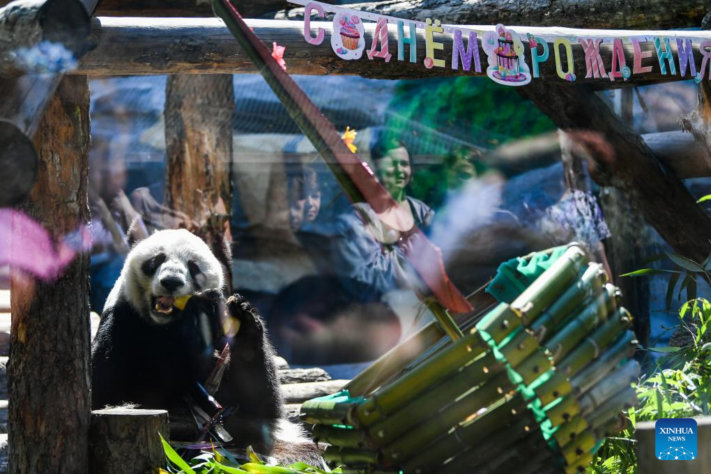 Giant panda Dingding enjoys a birthday meal during her birthday celebration at the Moscow Zoo in Moscow, capital of Russia, July 30, 2023. Two giant pandas from China, Ruyi and Dingding, who have been living at the Moscow Zoo since 2019, enjoyed their birthday celebrations in Russia on Sunday. (Xinhua/Cao Yang)