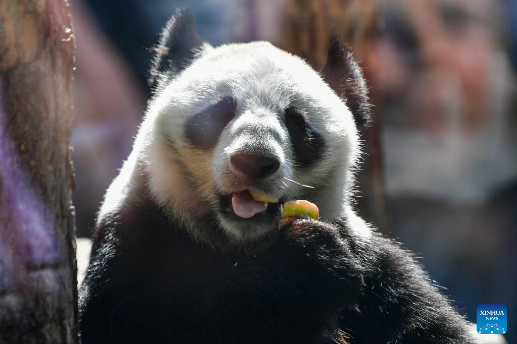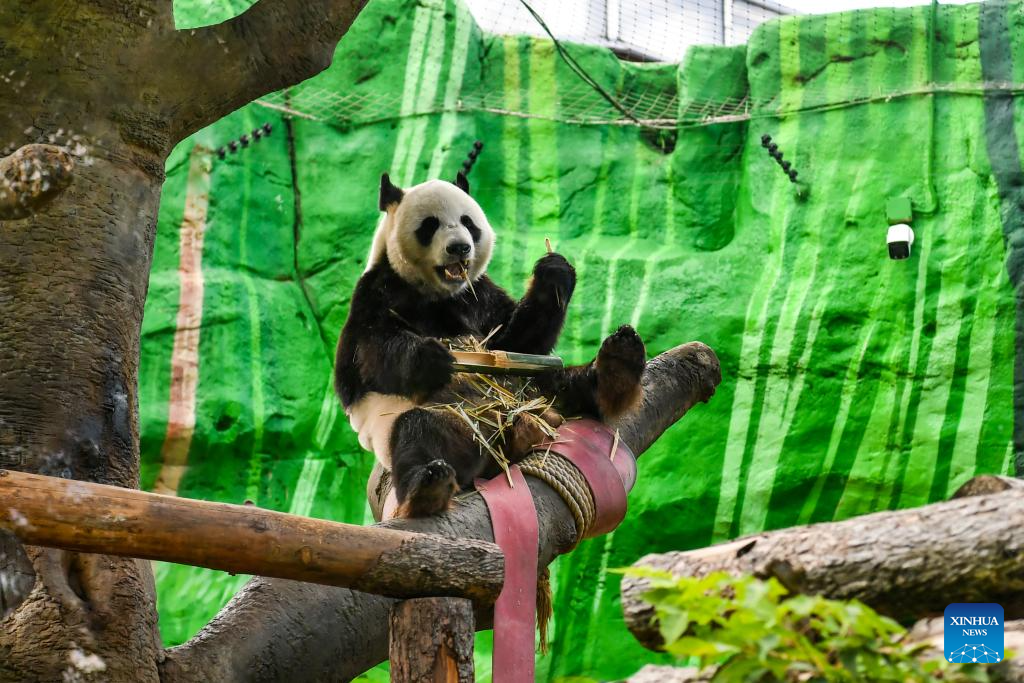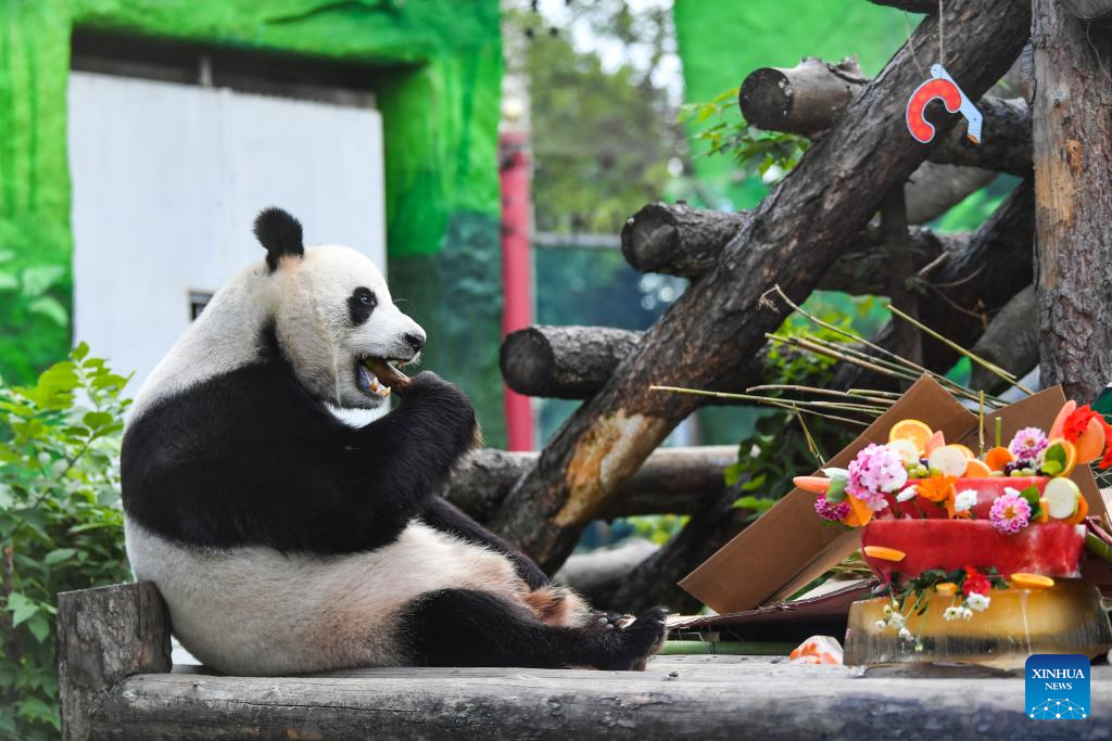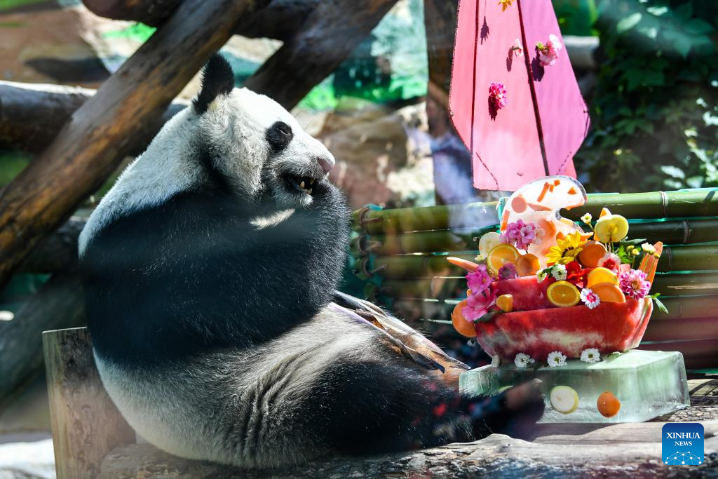 Giant panda Dingding enjoys a birthday meal during her birthday celebration at the Moscow Zoo in Moscow, capital of Russia, July 30, 2023. Two giant pandas from China, Ruyi and Dingding, who have been living at the Moscow Zoo since 2019, enjoyed their birthday celebrations in Russia on Sunday. (Xinhua/Cao Yang)