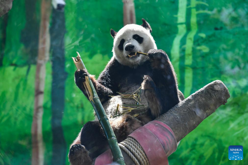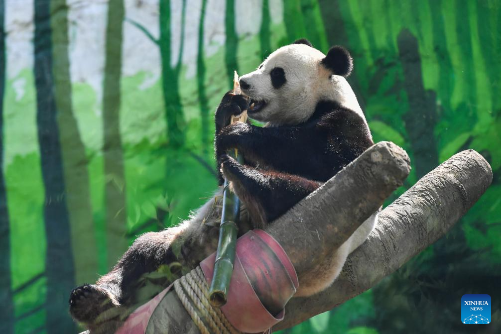 Giant panda Dingding eats bamboo during her birthday celebration at the Moscow Zoo in Moscow, capital of Russia, July 30, 2023. Two giant pandas from China, Ruyi and Dingding, who have been living at the Moscow Zoo since 2019, enjoyed their birthday celebrations in Russia on Sunday. (Xinhua/Cao Yang)