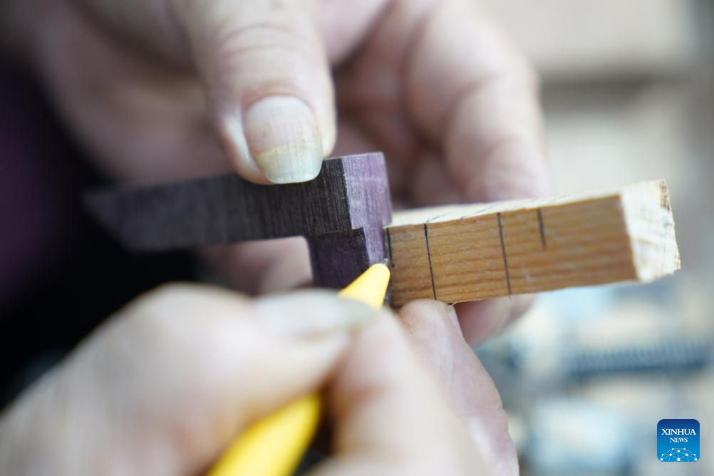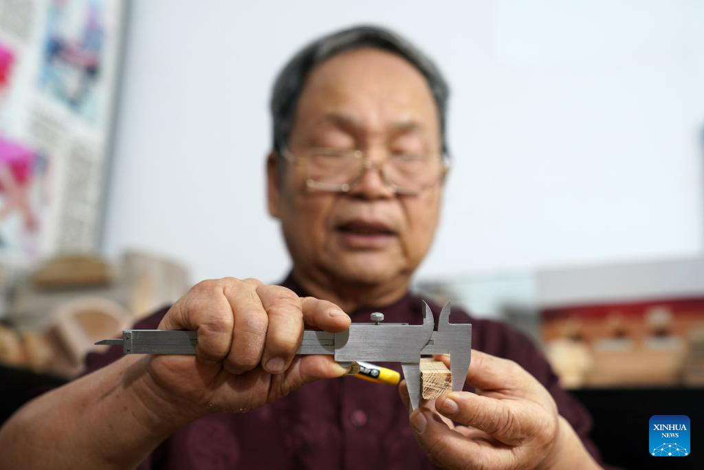 Craftsman Hou Quanchen makes a Kong Ming Lock at a workshop in Shahe City, north China's Hebei Province, July 30, 2023.?(Xinhua/Mu Yu)