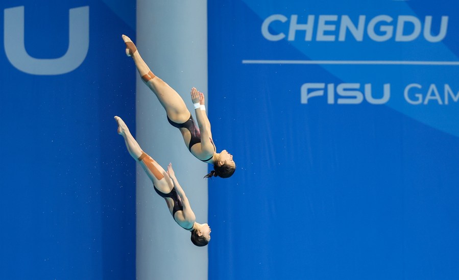 Zhang Jiaqi (bottom)/Zhang Minjie of China compete in the women's synchronised 10m platform final at the 31st FISU Summer World University Games in Chengdu, southwest China's Sichuan Province, July 31, 2023. (Xinhua/Wang Xiang)