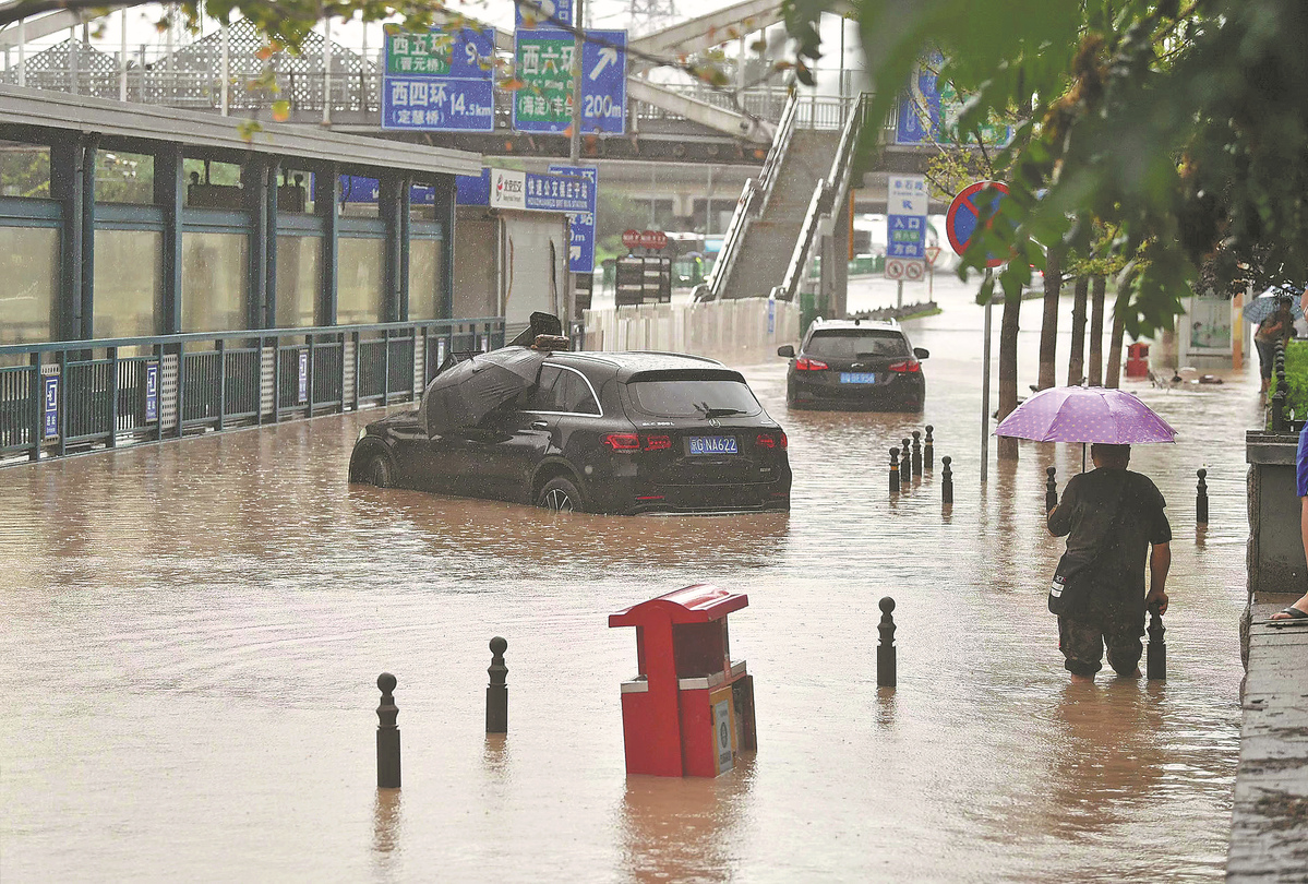 Cars lie stranded on a flooded road in Mentougou district, western Beijing, on Monday. As of 3:30 pm on Monday, Mentougou had received 320.8 millimeters of rainfall. YUAN YI/FOR CHINA DAILY