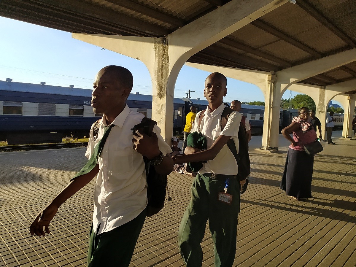 Students take a train of the Tanzania-Zambia Railway to go to school. (People's Daily/Huang Peizhao)