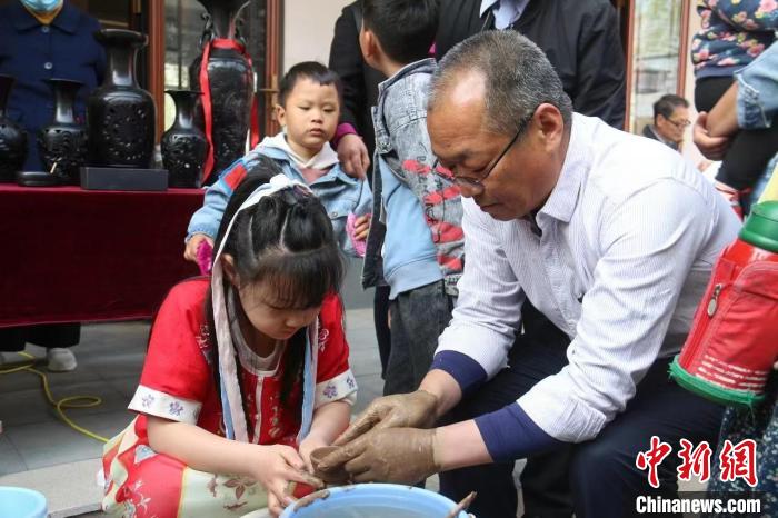 Wang Baoxiang, a craftsman in Chengwu county, Heze city, east China's Shandong Province, instructs a girl to make black pottery. (Photo courtesy of the culture and tourism bureau of Chengwu county)