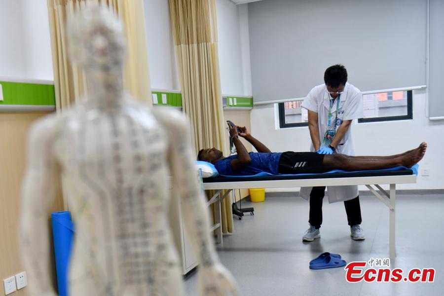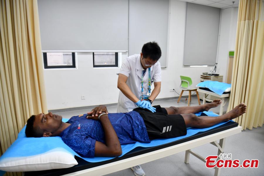 An athlete from Sri Lanka receives traditional Chinese massage at the medical center of the 31st FISU Summer Games Village in Chengdu, southwest China's Sichuan Province, July 31, 2023. (Photo/China News Service/Zhang Lang)