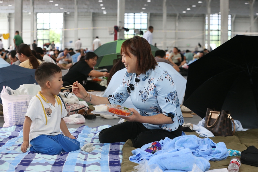 Villagers from Mayu village of Beijing's Shijingshan district have lunch at a temporary shelter in Shougang Park on Aug 1, 2023. [Photo by Wu Xiaohui/chinadaily.com.cn]