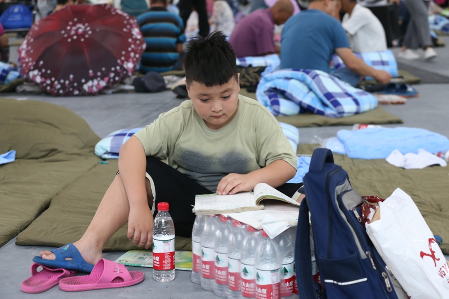 A pupil studies at a temporary shelter in Shougang Park on Aug 1, 2023. [Photo by Wu Xiaohui/chinadaily.com.cn]