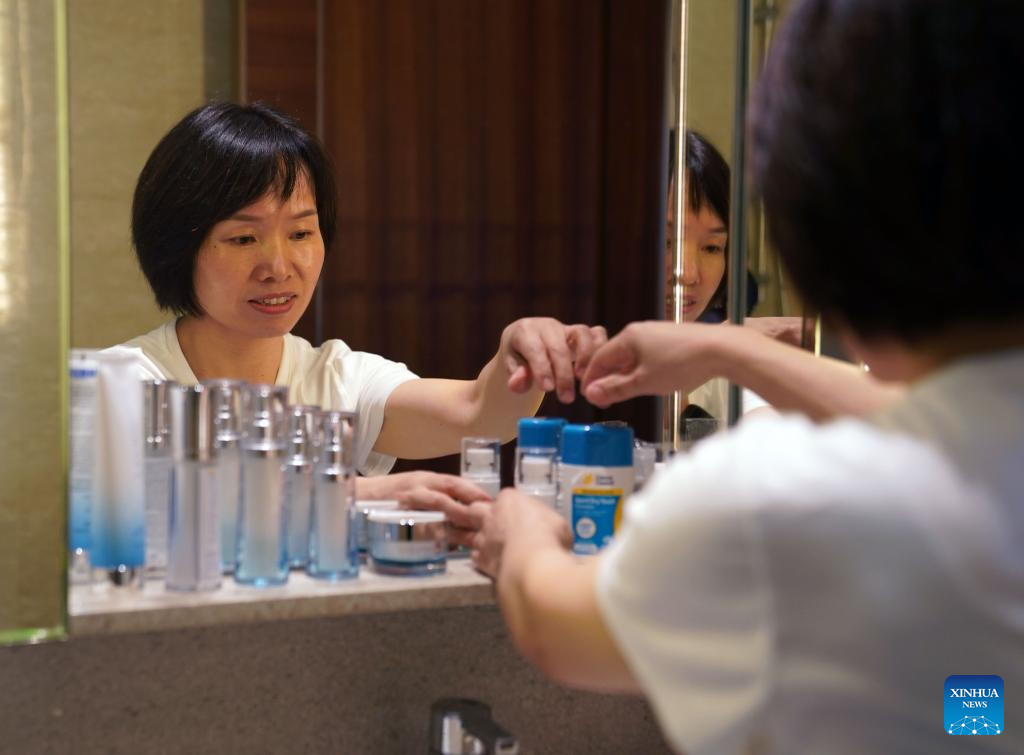 Zhu Chunnan arranges a wall cabinet at her employer's home in east China's Shanghai, July 29, 2023. (Xinhua/Liu Ying)