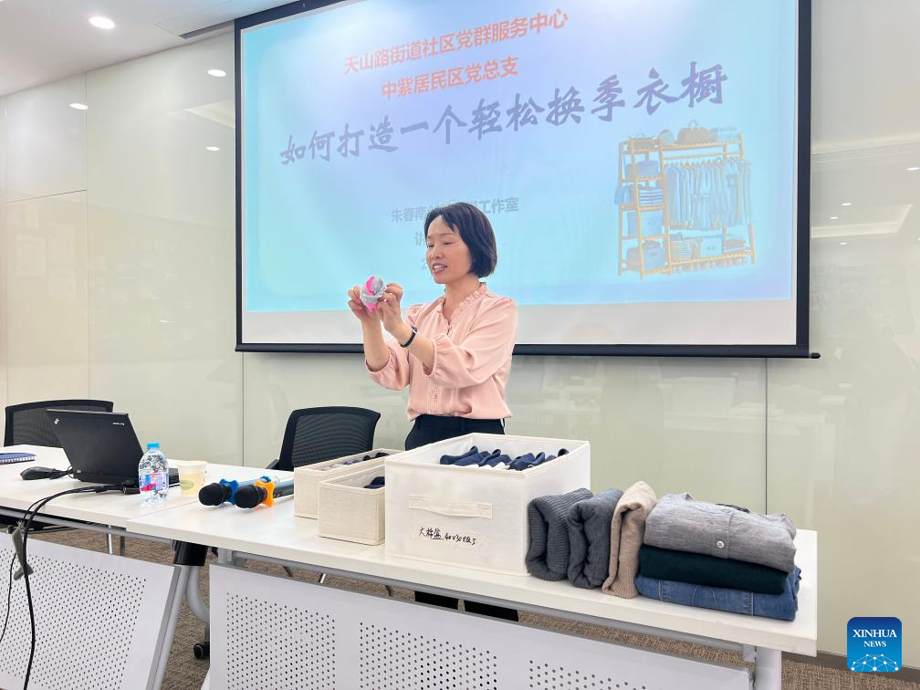 Zhu Chunnan gives a lecture on closet arrangement at a community in east China's Shanghai, May 30, 2023. (Xinhua/Liu Ying)