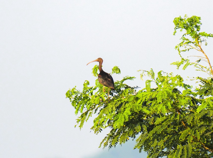 A glossy ibis perches on a tree branch in the Shuanggui Lake national wetland park in Liangping district of southwest China's Chongqing Municipality. (Photo/Yu Huaixian)