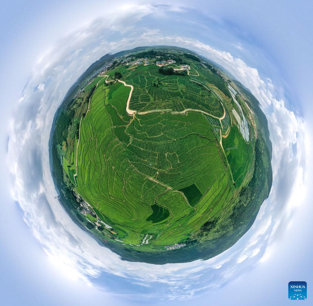 This aerial panoramic photo taken on Aug. 1, 2023 shows the hybrid rice planting base in Xinchang Village of Cengong County in southwest China's Guizhou Province. Cengong is a major rice-growing county in China with an annual yield of over 8 million kilograms of certified seeds. (Xinhua/Yang Wenbin)