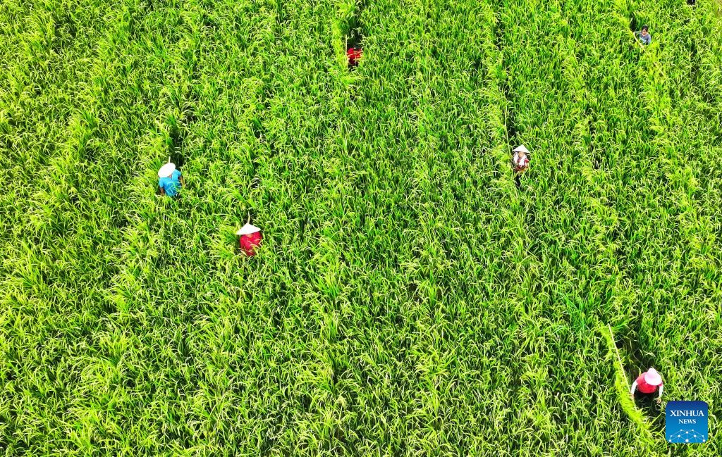 This aerial photo taken on Aug. 1, 2023 shows farmers pollinating rice seedlings at the hybrid rice planting base in Xinchang Village of Cengong County in southwest China's Guizhou Province. Cengong is a major rice-growing county in China with an annual yield of over 8 million kilograms of certified seeds. (Xinhua/Yang Wenbin)