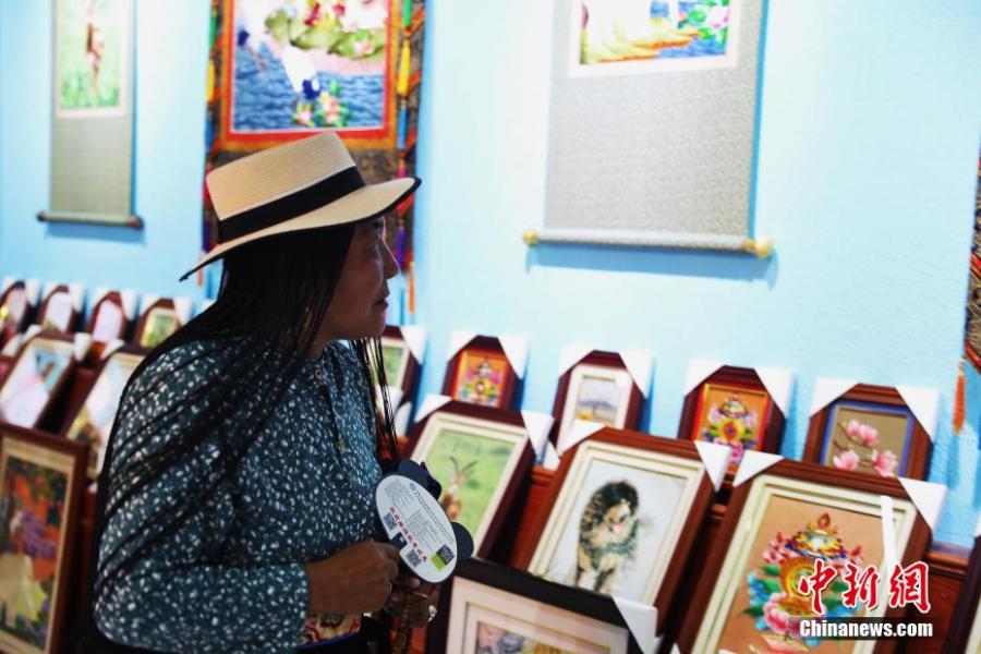 A visitor views Tibetan embroidery artworks displayed at a workshop in Hainan Tibetan Autonomous Prefecture, southeastern Qinghai Province, Aug. 1, 2023. (Photo: China News Service/Xue Di)