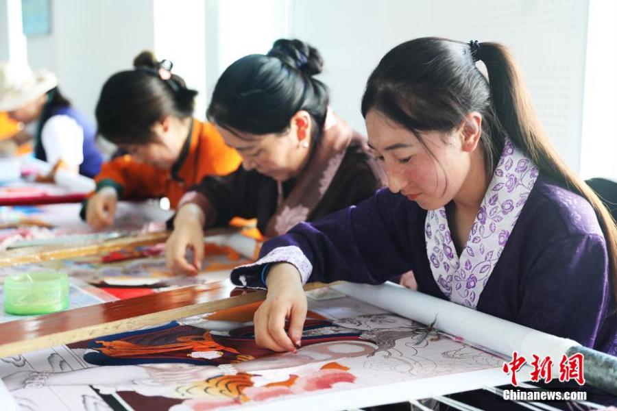 Local women make Tibetan embroidery artworks at a workshop in Hainan Tibetan Autonomous Prefecture, southeastern Qinghai Province, Aug. 1, 2023. (Photo: China News Service/Xue Di)