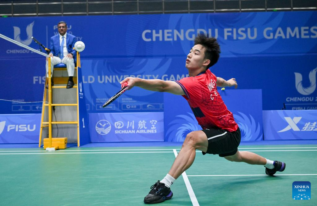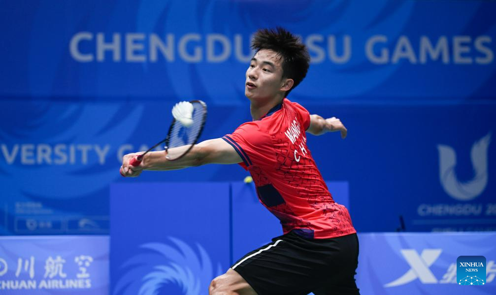 Wang Zhengxing of China competes during the men's singles match against Saran Jamsri of Thailand in the Badminton Mixed Team Semifinal match between team China and team Thailand at the 31st FISU Summer World University Games in Chengdu, southwest China's Sichuan Province, Aug. 2, 2023. (Xinhua/Zhang Duan)