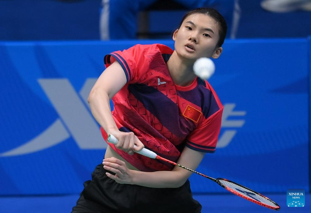 Han Yue of China competes during the women's singles match against Lalinrat Chaiwan of Thailand in the Badminton Mixed Team Semifinal match between team China and team Thailand at the 31st FISU Summer World University Games in Chengdu, southwest China's Sichuan Province, Aug. 2, 2023. (Xinhua/Jigme Dorji)