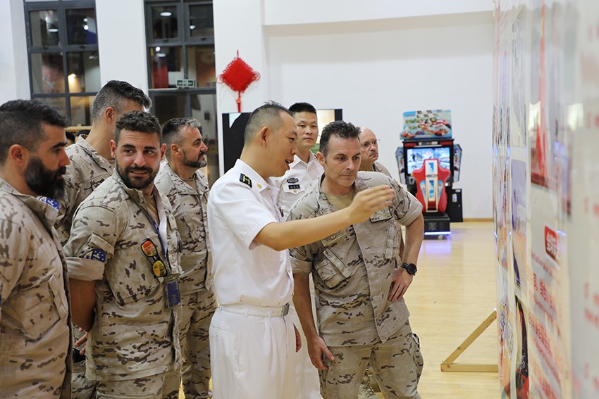 An officer of the Chinese People's Liberation Army (PLA) Support Base in Djibouti explains China's Belt and Road Initiative, and the idea of building a community with a shared future for mankind, to foreign officers and soldiers at an activity held to mark the 96th anniversary of the founding of the PLA and the sixth anniversary of the establishment of the PLA Support Base in Djibouti. (Photo/People's Daily Online)