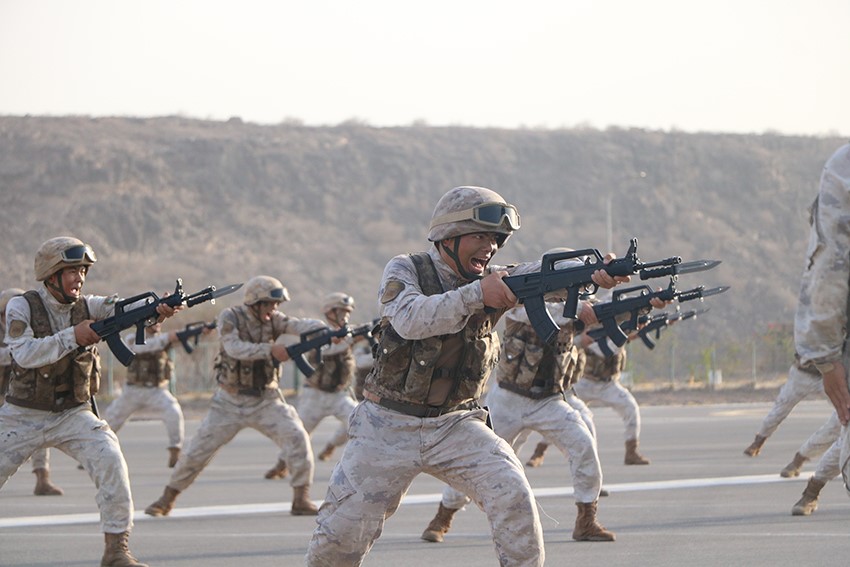 Soldiers display a bayonet charge exercise, combat skills, and other elements of basic military training courses at an activity marking the 96th anniversary of the founding of the Chinese People's Liberation Army (PLA) and the sixth anniversary of the establishment of the PLA Support Base in Djibouti. (Photo/People's Daily Online)