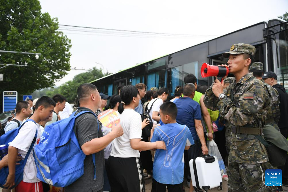 Soldiers lead passengers to get on a transshipment vehicle in Miaofengshan Town of Mentougou District, Beijing, capital of China, Aug. 2, 2023. Train passengers trapped in Mentougou District due to heavy rainfall have been safely transferred on Wednesday. (Xinhua/Ju Huanzong)