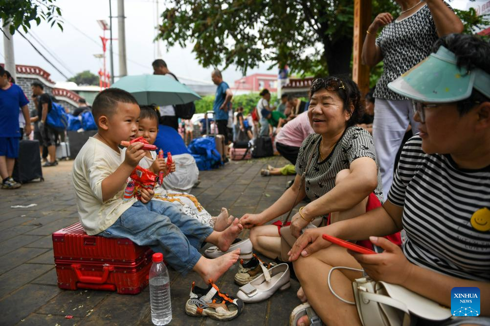 Passengers of Train K396 rest and wait to be transferred in Miaofengshan Town of Mentougou District, Beijing, capital of China, Aug. 2, 2023. Train passengers trapped in Mentougou District due to heavy rainfall have been safely transferred on Wednesday. (Xinhua/Ju Huanzong)