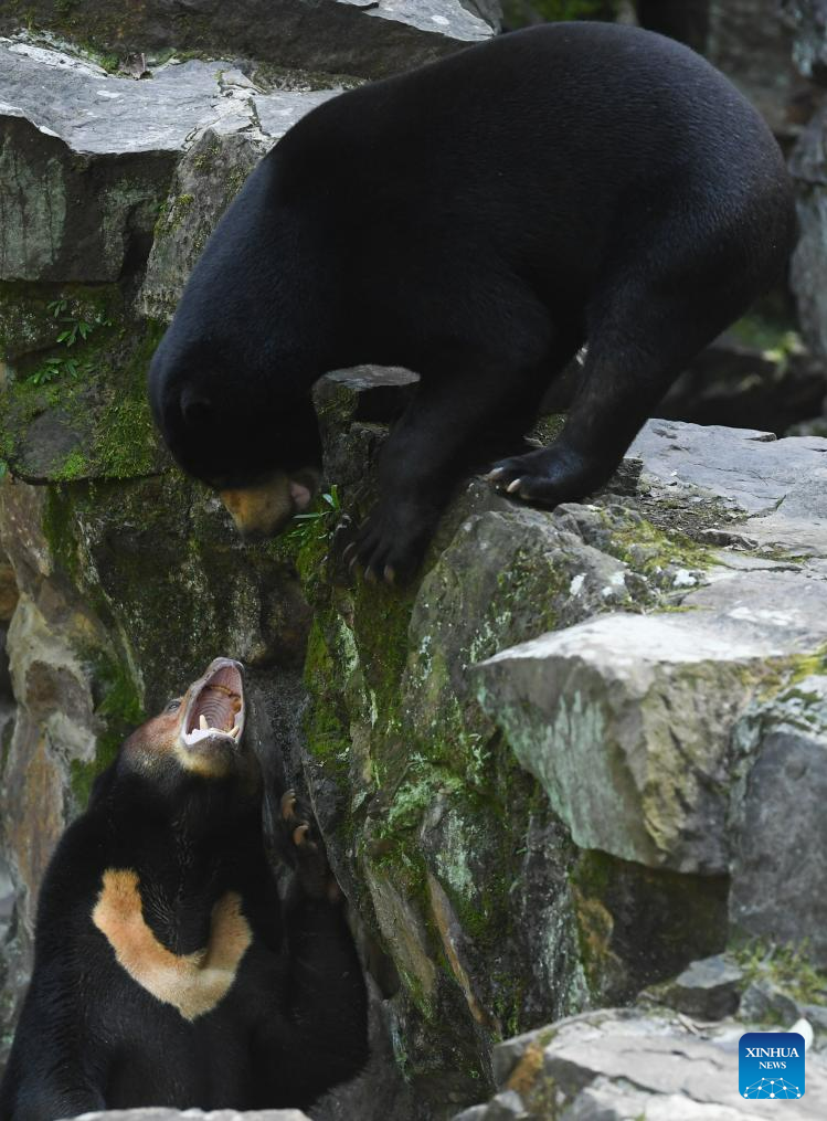 Sun bears play at Hangzhou Zoo in Hangzhou, east China's Zhejiang Province, Aug. 2, 2023. A video of a four-year-old sun bear standing upright like a human being at Hangzhou Zoo in east China's Zhejiang Province went viral on social media recently, attracting an increased number of tourists coming here to see it. (Xinhua/Weng Xinyang)