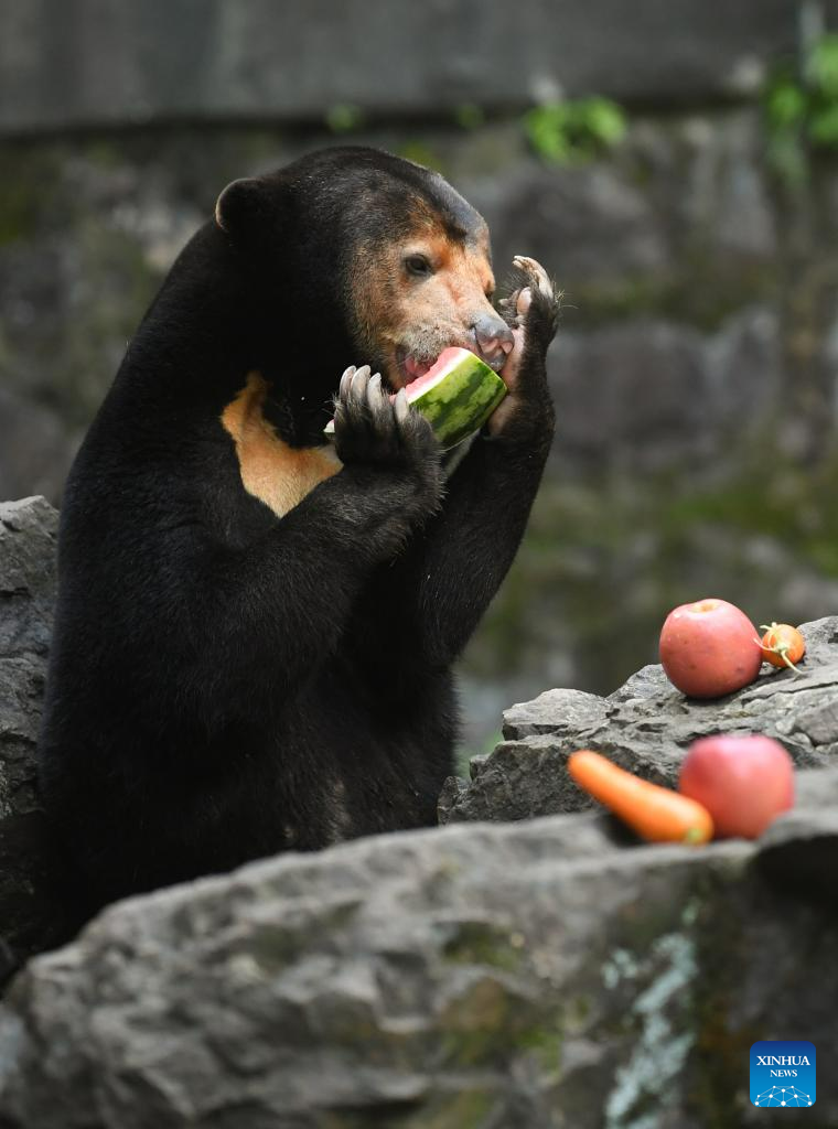 A sun bear enjoys fruits at Hangzhou Zoo in Hangzhou, east China's Zhejiang Province, Aug. 2, 2023. A video of a four-year-old sun bear standing upright like a human being at Hangzhou Zoo in east China's Zhejiang Province went viral on social media recently, attracting an increased number of tourists coming here to see it. (Xinhua/Weng Xinyang)