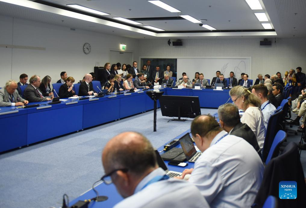 A seminar is held in Vienna, Austria, on Aug. 2, 2023. The AUKUS nuclear submarine deal poses a serious risk to regional and global security, according to a joint report released on Wednesday by a Chinese and a Russian think tank at the seminar here. (Xinhua/He Canling)