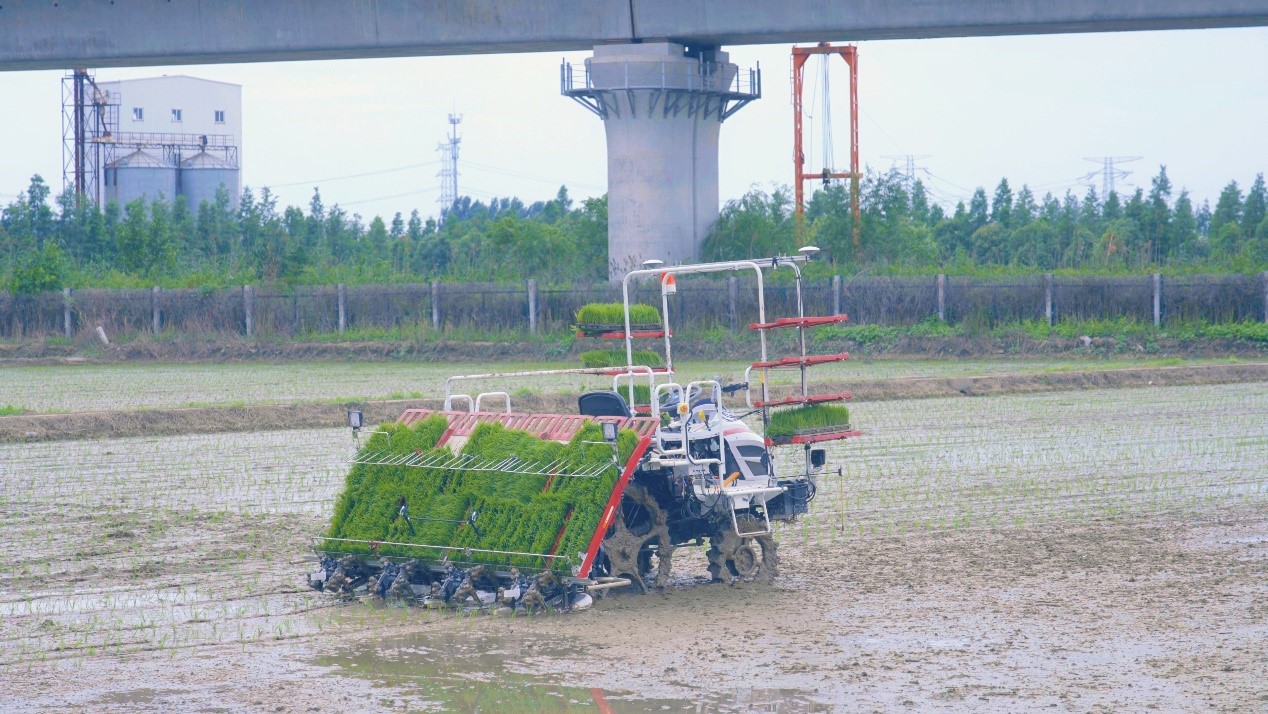 An unmanned rice transplanter, equipped with the BeiDou Navigation Satellite System, works in a rice paddy. (Photo courtesy of the interviewee)