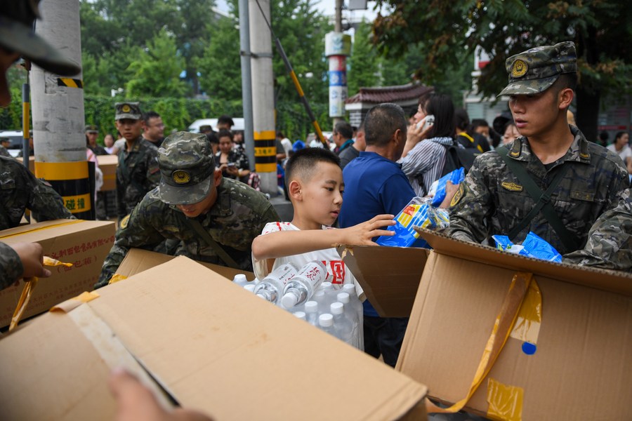 Soldiers distribute food and water to passengers of Train K396 in Miaofengshan Town of Mentougou District, Beijing, capital of China, Aug. 2, 2023. (Xinhua/Ju Huanzong)