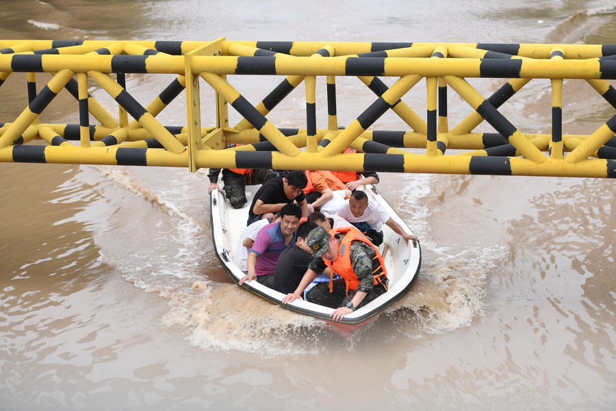 People take a rescue boat to a transshipment point in Fangshan District of Beijing, capital of China, Aug. 2, 2023. (Xinhua/Ren Chao)
