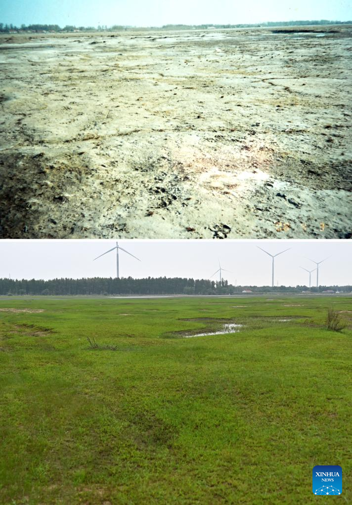This combo photo shows the sandy land before sand control in Bulteger Gacha, Horqin Left Wing Rear Banner of Tongliao City, north China's Inner Mongolia Autonomous Region in 2008 (above, file photo) and the meadow in front of Bai Shun's house in Bulteger Gacha, Horqin Left Wing Rear Banner of Tongliao City, north China's Inner Mongolia Autonomous Region, Aug. 2, 2023 (below, photo taken by Xinhua photographer Huang Xiaoyong). (Xinhua)
