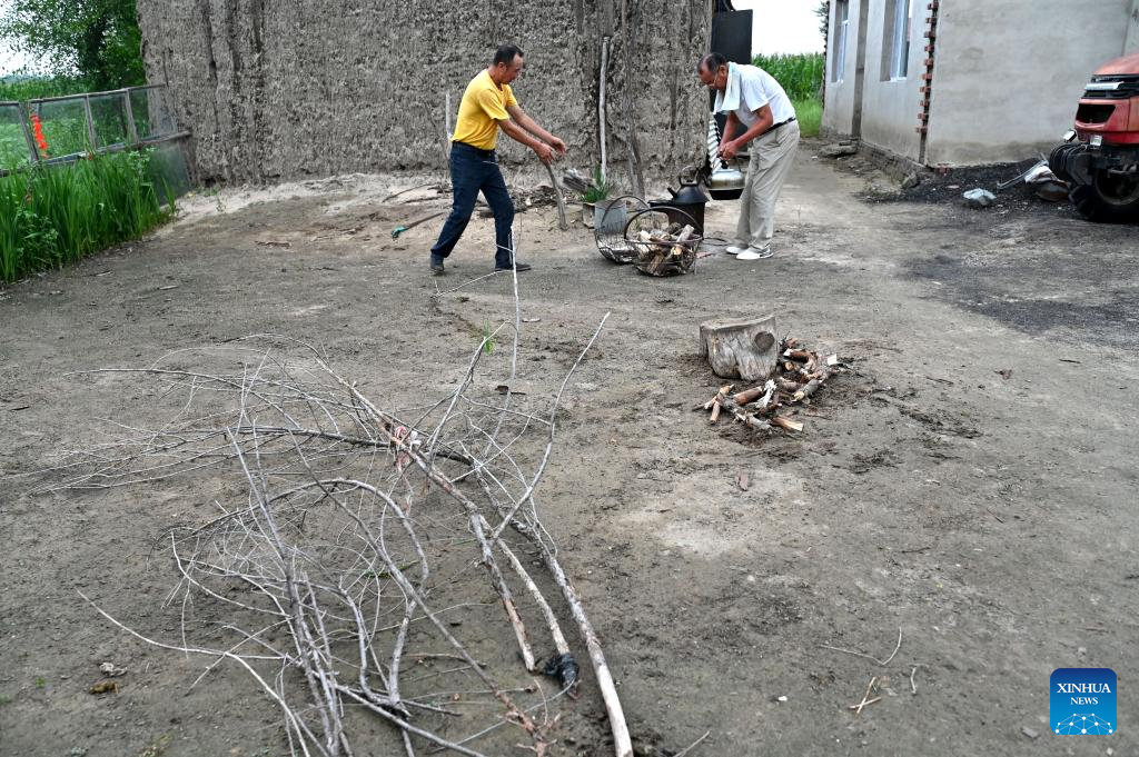 Bai Shun (R) boils water at his house in Bulteger Gacha, Horqin Left Wing Rear Banner of Tongliao City, north China's Inner Mongolia Autonomous Region, Aug. 2, 2023. (Xinhua/Cai Yang)