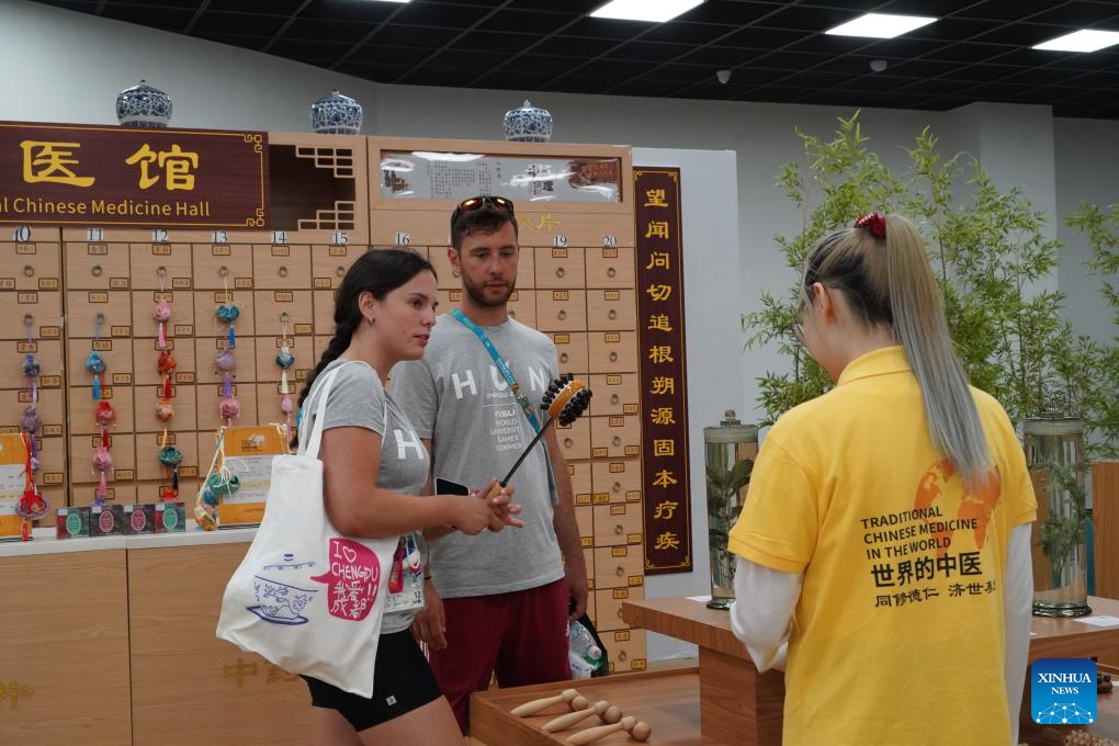 CHENGDU, Aug. 3 (Xinhua) -- From pulse diagnosis to rehabilitation services, traditional Chinese medicine (TCM) specialists are taking every measure to ensure athletes are in tip-top shape at the FISU Games Village, which is housing those participating in the ongoing 31st FISU World University Games in Chengdu, the capital city of southwest China's Sichuan Province.