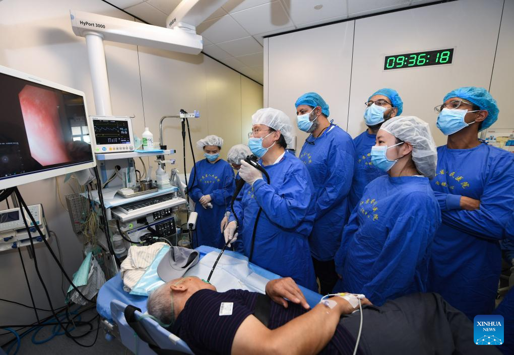 Foreign medical workers of a medical seminar watch as Fan Zhining, expert of digestive endoscopy, performs an operation at digestive endoscopy center of Jiangsu Province Hospital in Nanjing, capital of east China's Jiangsu Province, Aug. 1, 2023. In recent years, Jiangsu Province Hospital cooperated with medical institutions in Pakistan, Egypt and other countries and regions in the field of digestive endoscopy to promote medical cooperation under the Belt and Road Initiative. (Xinhua/Ji Chunpeng)