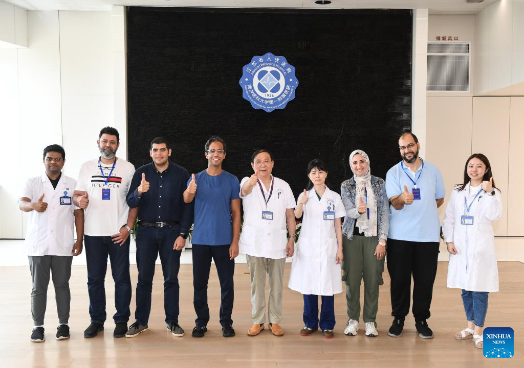 Fan Zhining (2nd L), expert of digestive endoscopy, attends a morning session with foreign medical workers of a medical seminar at Jiangsu Province Hospital in Nanjing, capital of east China's Jiangsu Province, Aug. 1, 2023. In recent years, Jiangsu Province Hospital cooperated with medical institutions in Pakistan, Egypt and other countries and regions in the field of digestive endoscopy to promote medical cooperation under the Belt and Road Initiative. (Xinhua/Ji Chunpeng)