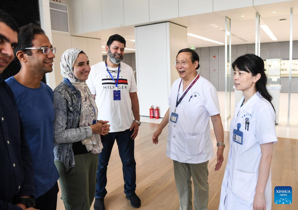 Fan Zhining (2nd R), expert of digestive endoscopy, talks with foreign medical workers of a medical seminar at Jiangsu Province Hospital in Nanjing, capital of east China's Jiangsu Province, Aug. 1, 2023. In recent years, Jiangsu Province Hospital cooperated with medical institutions in Pakistan, Egypt and other countries and regions in the field of digestive endoscopy to promote medical cooperation under the Belt and Road Initiative. (Xinhua/Ji Chunpeng)