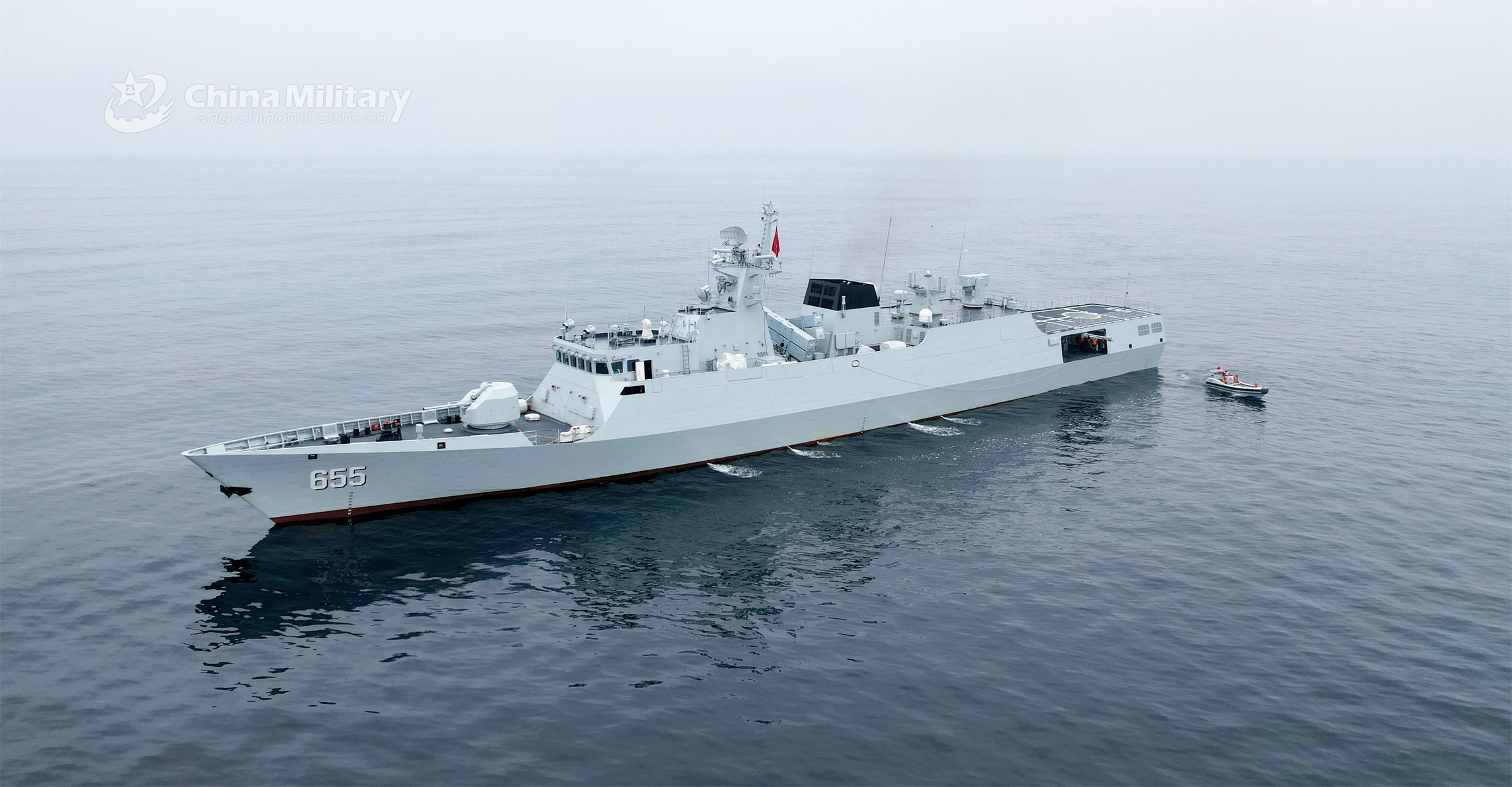 A frigate attached to a flotilla under the PLA Northern Theater Command releases the boat for the temporary inspection, visit, board, search and seizure (VBSS) training during a real-combat training exercise in late July, 2023. (eng.chinamil.com.cn/Photo by Li Kang)