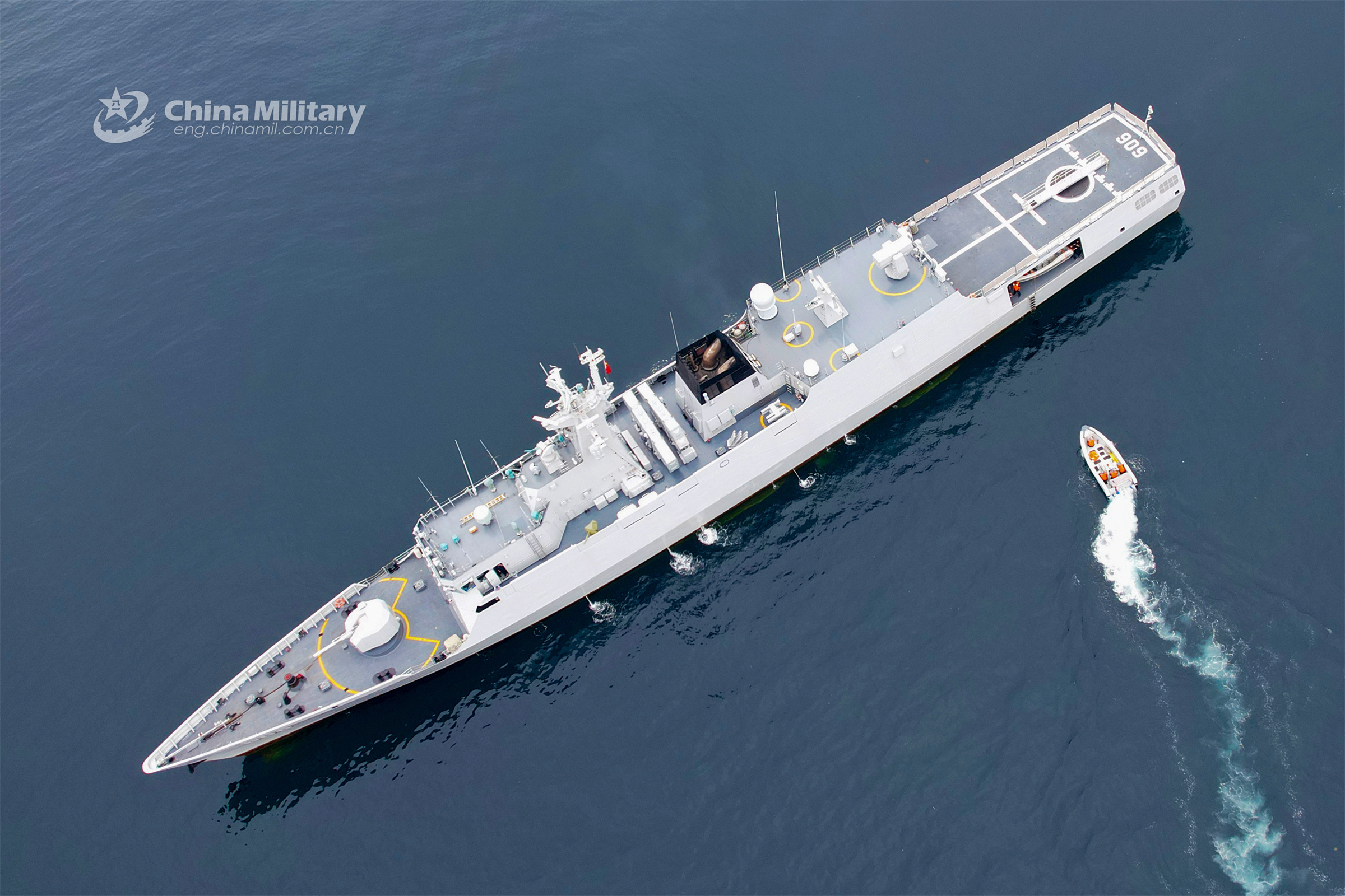 A frigate attached to a flotilla under the PLA Northern Theater Command gets ready to conduct temporary inspection, visit, board, search and seizure (VBSS) training during a real-combat training exercise in late July, 2023. (eng.chinamil.com.cn/Photo by Li Kang)
