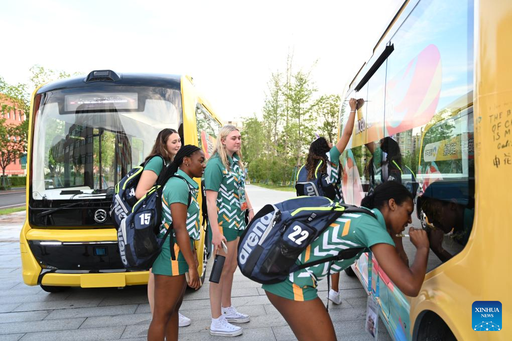 This photo taken on Aug. 2, 2023 shows student-athletes from South Africa signing on the self-driving bus in the Village of the 31st FISU Summer World University Games in Chengdu, capital city of southwest China's Sichuan Province. (Xinhua/Hua Hongli)