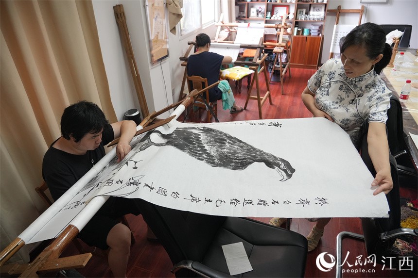 A student of Gu Yuchun, inheritor of embroidery on Xuan paper, a provincial-level intangible cultural heritage item of east China's Jiangxi Province, creates embroidery work with Xuan paper. (People's Daily Online/Kong Wenjin)