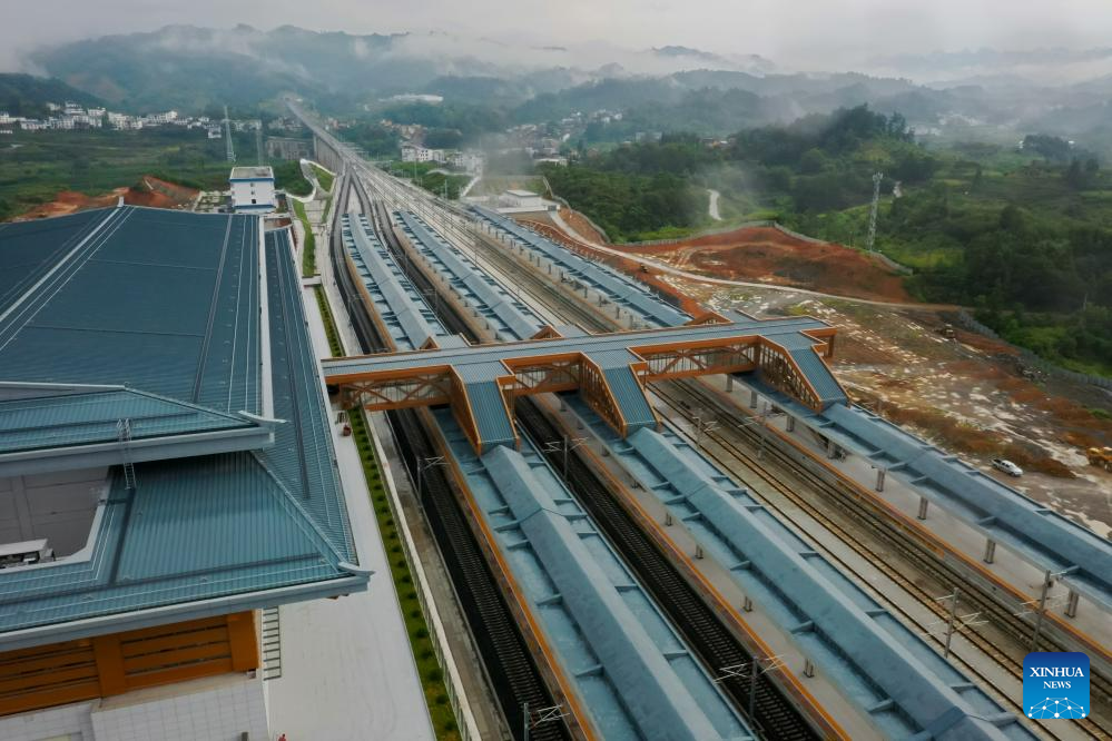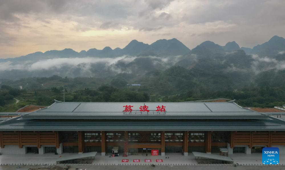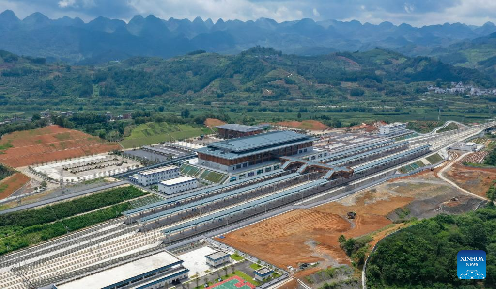 This aerial photo taken on Aug. 3, 2023 shows the Libo Railway Station in Libo, southwest China's Guizhou Province. (Xinhua/Liu Xu)
