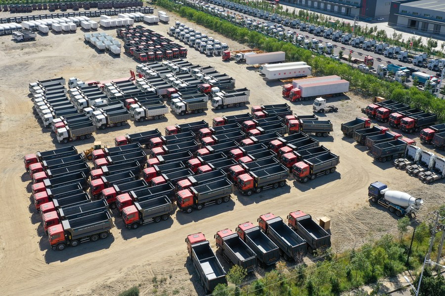 This aerial photo taken on July 26, 2023 shows domestically-made vehicles at the Horgos Port in northwest China's Xinjiang Uygur Autonomous Region. (Xinhua/Ding Lei)