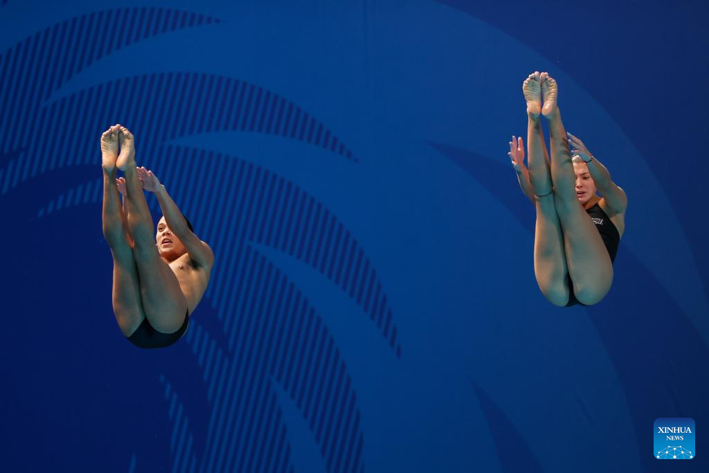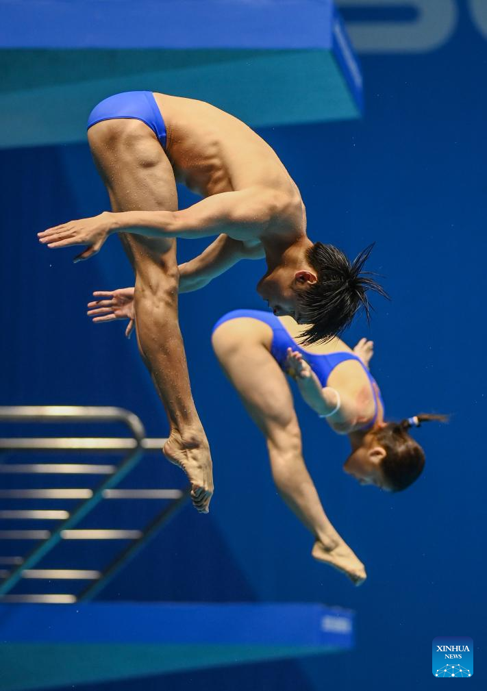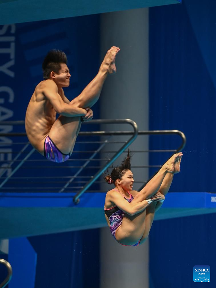 Wang Weiying (Rear) and Yang Ling of China compete during the Mixed Synchronised 3m Springboard Final of diving at the 31st FISU Summer World University Games in Chengdu, southwest China's Sichuan Province, Aug. 3, 2023. (Xinhua/Liu Kun)