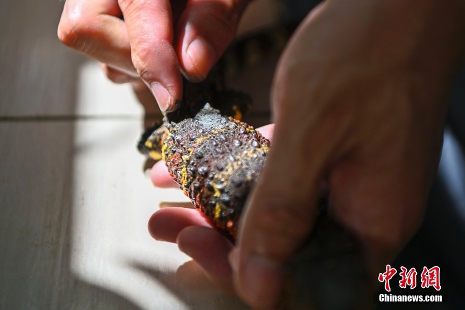 He Nan, a Chinese crocodile lizard conservator at the Luokeng nature reserve in south China's Guangdong Province, applies medicinal powder to the wounds on a Chinese crocodile lizard which got injured in a fight. (China News Service/Chen Jimin)