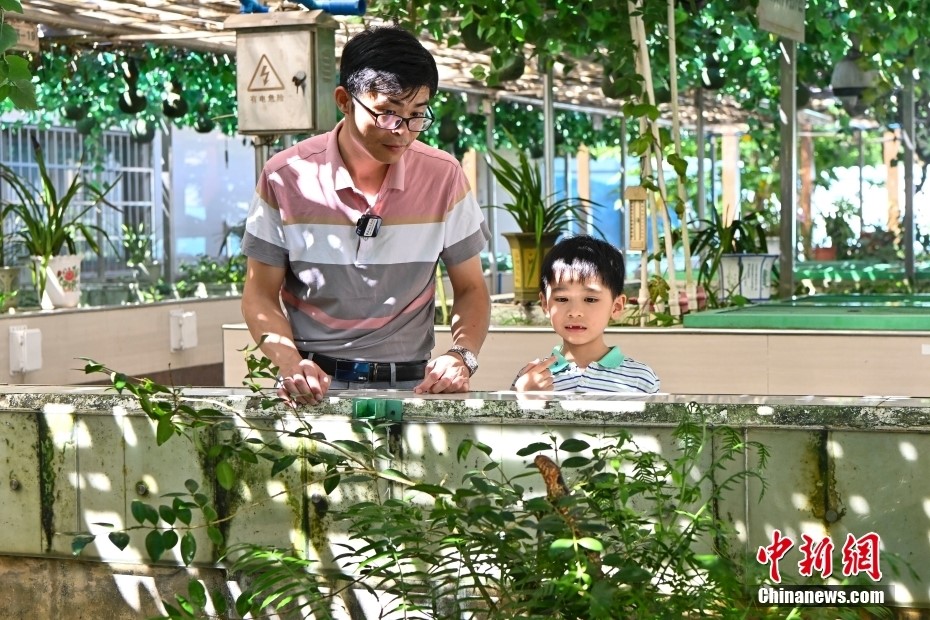 He Nan, a Chinese crocodile lizard conservator at the Luokeng nature reserve in south China's Guangdong Province, observes Chinese crocodile lizards with his son in the Chinese crocodile lizard research center of the nature reserve. (China News Service/Chen Jimin)